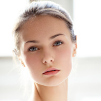 blue eyes, and light-colored hair. The woman is wearing what appears to be a light-colored top or blouse with some form of embellishment on the shoulder or sleeve area. Her expression is neutral with a hint of thoughtfulness. The background is softly focused, suggesting