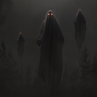 ghostly figures appearing as transparent, misty apparitions in the foreground. They seem to be standing amidst a foggy,