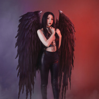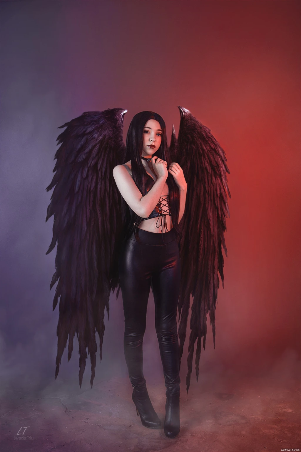 a young woman with long dark hair, wearing black attire and large black wings that extend from her shoulders. She has
