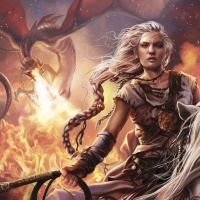 long hair and is wearing armor, suggesting she might be a warrior or leader in a story or game setting. In the background, there are two dragons: one with its wings spread wide, appearing fierce, and another that appears to be either tamed or subdued. The character's presence on horseback and her attire contribute to