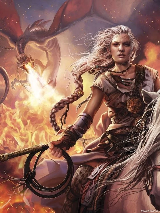 a female character on horseback. She has