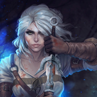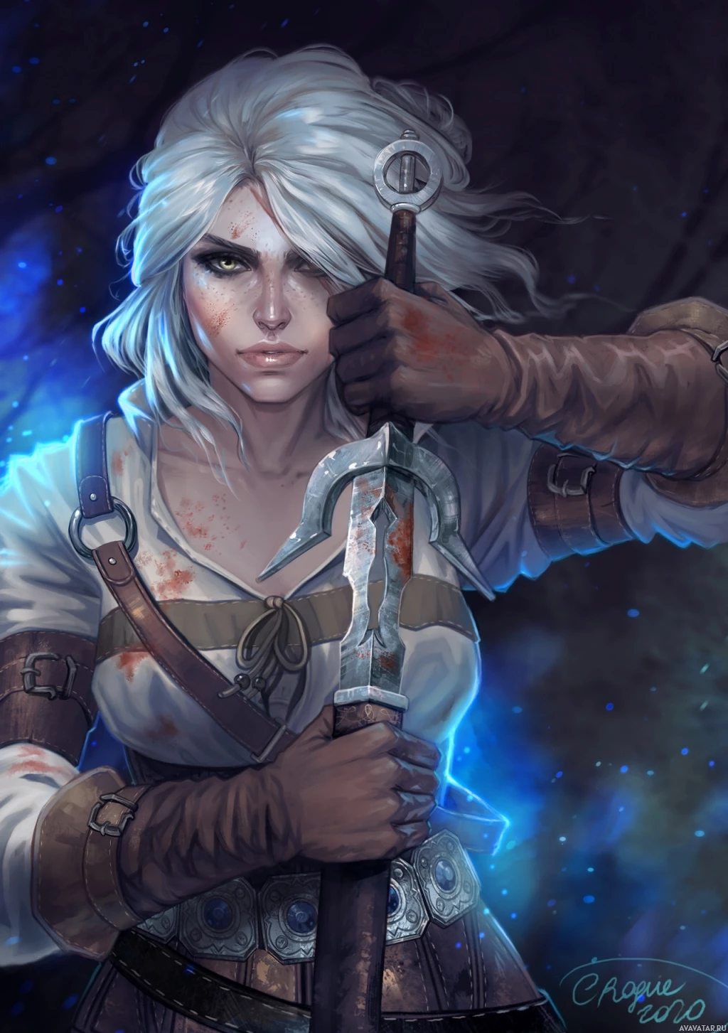 The image features an illustration of a character known as Ciri from the game "The Witcher." She is depicted holding a sword with both hands, and her attire suggests she might be from