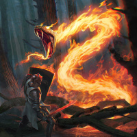 На картинке изображена сцена фэнтези, где сзади виден воин, воюющий со змеей. Змея, кажется, имеет огненное тело или хвост, и вокруг руки воина есть огненные элементы, как будто они заклинают или носят оружие, которое излучает пламя. Это предполагает элемент магической или сверхъестественной борьбы. Сцена, кажется, лесистая область с упавшими ветвями на земле, что добавляет интенсивности боевой сцены.