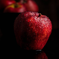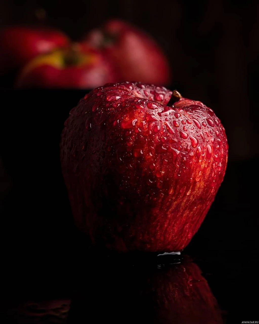 На картинке яблоко изображено крупным планом. Оно свежевымытое, о чем свидетельствуют капельки воды на его поверхности, и, судя по всему, относится к красному сорту яблок. Фон темный, что подчеркивает яркий цвет фрукта.