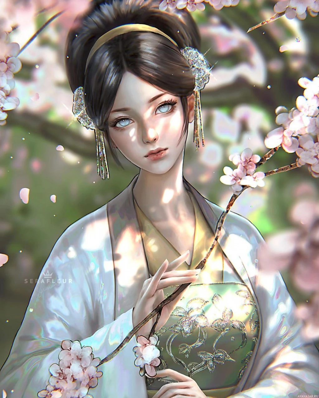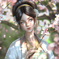 cherry blossoms, which are iconic symbols of spring in East Asian cultures and often associated with beauty and transient nature. The character appears to be standing still, gazing off to her side with