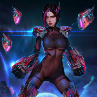 purple hair and is wearing an armored suit that includes red and black elements, which could suggest she's a fighter or warrior in the context of her story. There are floating objects resembling energy or particles around her hands, indicating some