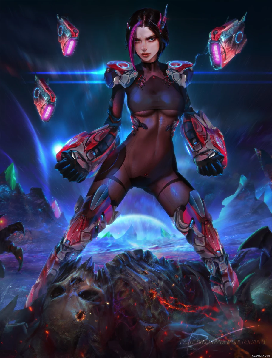 a science fiction setting. She has a humanoid form with