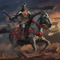 various adornments that might indicate status or rank within a military or noble context. The background is dramatic, with smoke and possibly cannons or