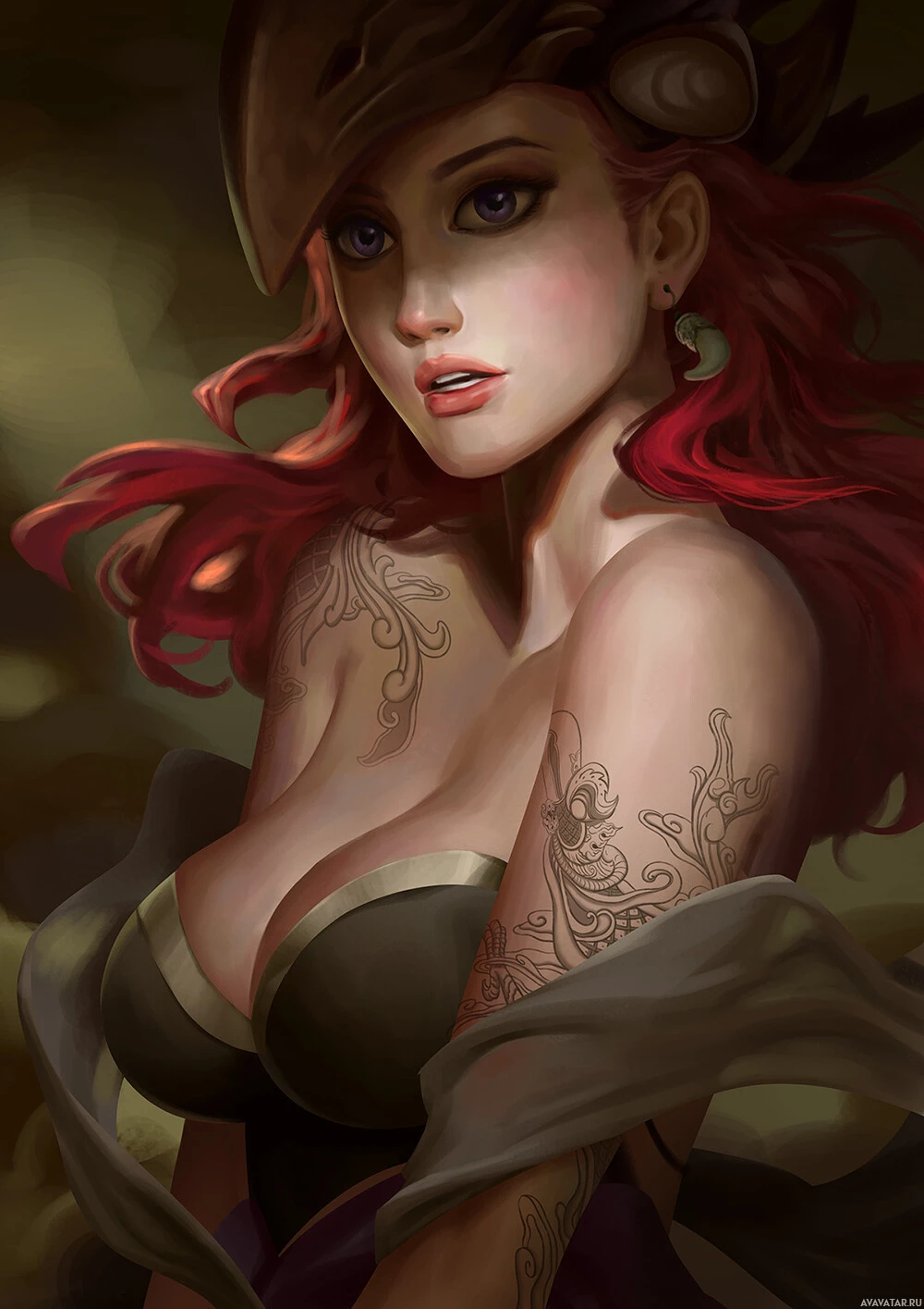 a fantasy setting, possibly inspired by steampunk elements given the design details. The character has tattoos on her arms, which are visible, and she's looking directly at the viewer with