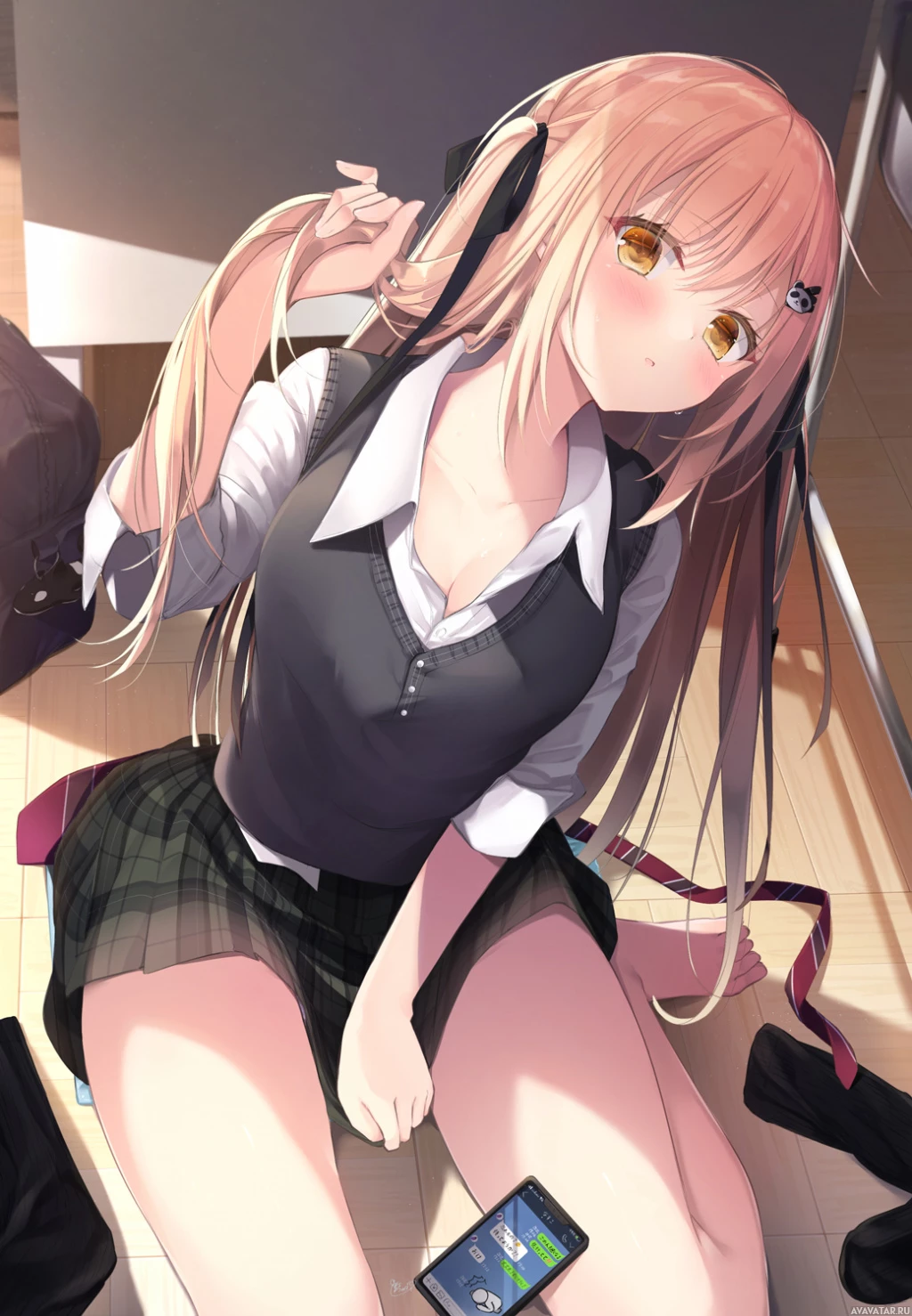 brown hair and is dressed in a black outfit with a vest, white shirt, and dark pants. The character appears to be sitting on the ground, wearing headphones around her neck. In front of her, there's a smartphone displaying some content on its screen. The setting looks like it could be inside a classroom or a similar