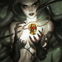 The image depicts a fantasy-themed character. The central figure appears to be a woman with