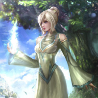 white hair and is wearing a long, elegant dress that appears to be made of a translucent or semi-transparent material. Her outfit features intricate details and designs that suggest she might have