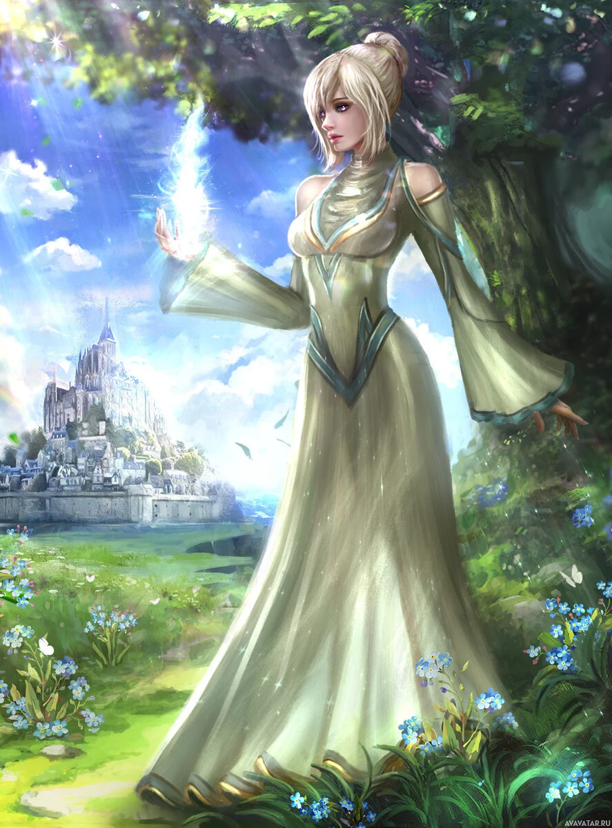 fantastical landscape with blue flowers on the ground, which adds to the enchanting atmosphere of the scene. The character's pose and expression convey