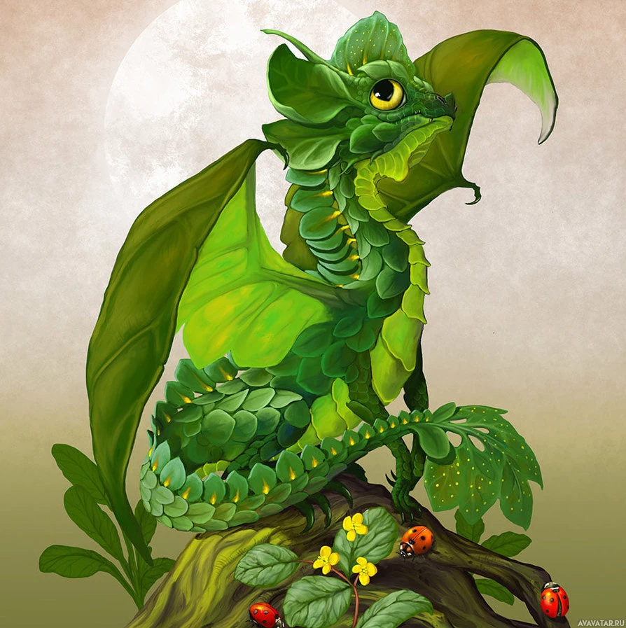 a small beetle next to one of the dragon's front claws. The overall color palette is dominated by greens and browns, creating an atmosphere that could be part of a forest or wilderness setting typical for