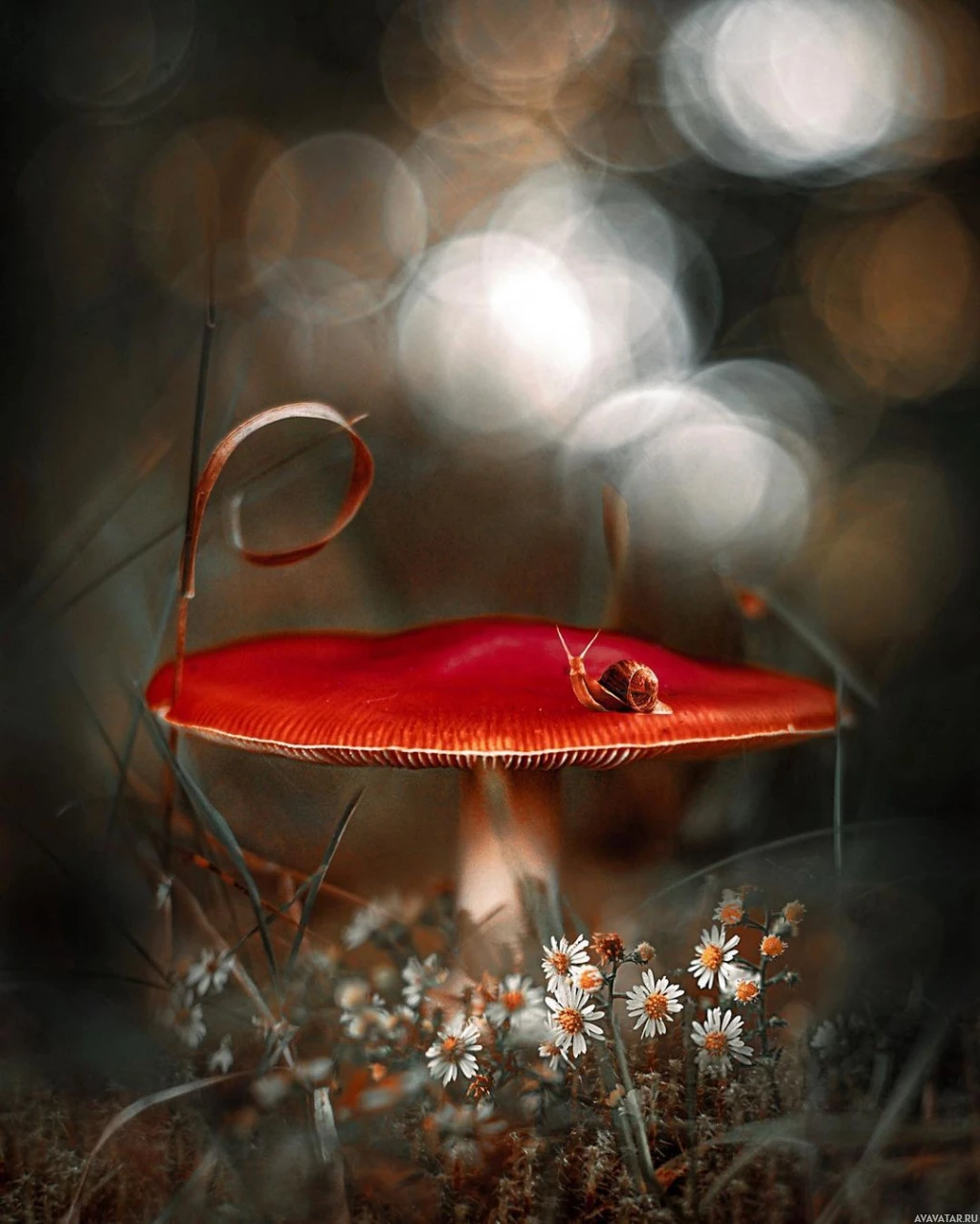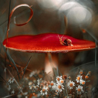 the blurred background and focus on the mushroom and flowers, creates a dreamy or fairytale-like atmosphere.