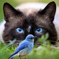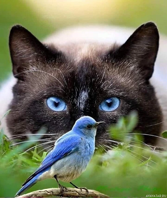 The picture features a cat and a bird. The cat has striking