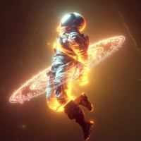 The image depicts an astronaut in a spacesuit, floating against the backdrop of space with nebulous formations and stars. The astronaut is performing what appears to be a circular motion or maneuvering as if on a mission. The overall setting suggests a science fiction or fantasy theme.