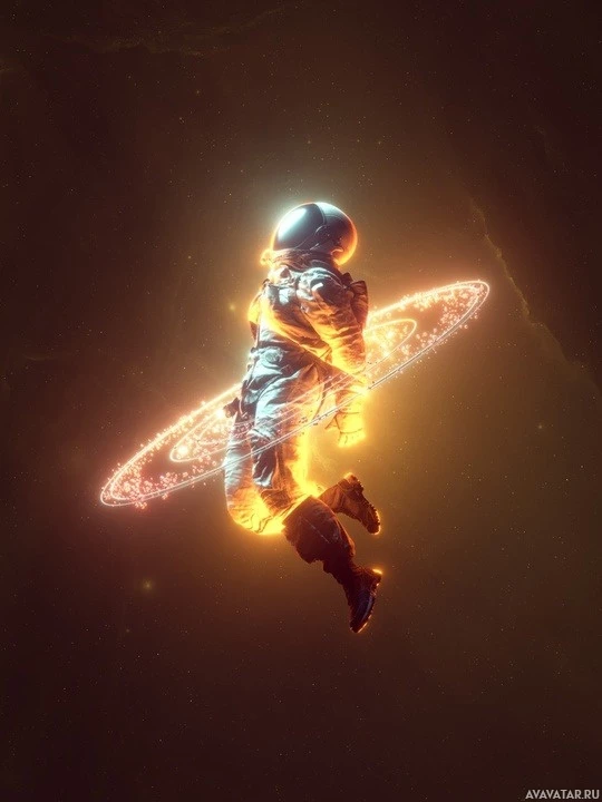 На картинке изображен астронавт в скафандре, парящий на фоне космического пространства с туманными образованиями и звездами. Астронавт совершает круговые движения или маневрирует, как будто выполняет задание. Общая обстановка напоминает научно-фантастическую или фэнтезийную тематику.
