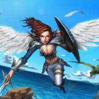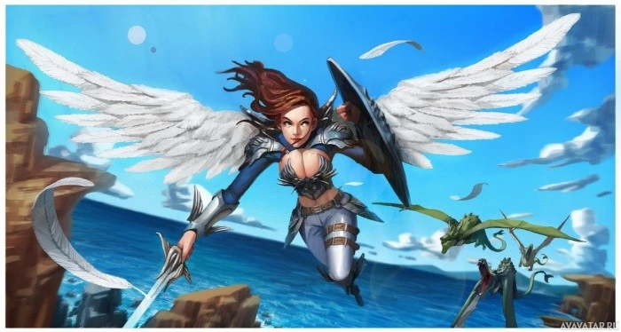 an angelic being, likely from a fantasy or video game context. She has wings and is holding what appears to be a staff with a feather at the end. Her attire includes armor and she has a sword in her left hand, suggesting she may be a warrior of some sort within this