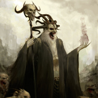 an evil sorcerer or wizard. This character is surrounded by dark, ominous figures that resemble zombies or undead creatures with glowing
