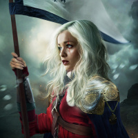 The image shows a woman with white hair, dressed in armor and holding a flag with a bird emblem on it. She is standing amidst dramatic, stormy clouds. The overall atmosphere of the picture suggests a historical or fantasy setting.