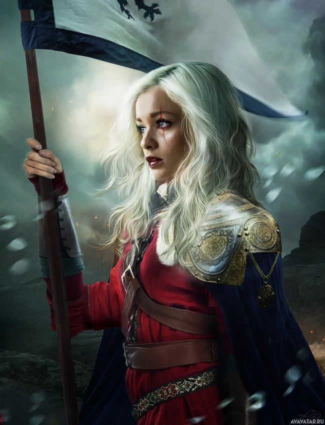 На картинке изображена седовласая женщина, облаченная в доспехи и держащая флаг с эмблемой птицы. Она стоит на фоне драматичных грозовых облаков. Общая атмосфера картины наводит на мысль об историческом или фантастическом окружении.