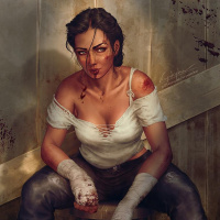 a white top and has visible injuries such as bruises and scrapes on her face, neck, and arms. Her expression is intense or defiant, and she has