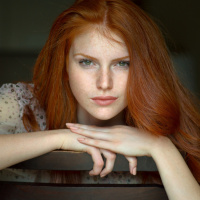 a young woman with red hair. She is posing with her chin resting on her hand, looking directly at the camera with a thoughtful or introspective expression. Her makeup and hairstyle are well-groomed, contributing to an elegant appearance. The background of the photo appears to be indoors, possibly inside a home or studio setting.