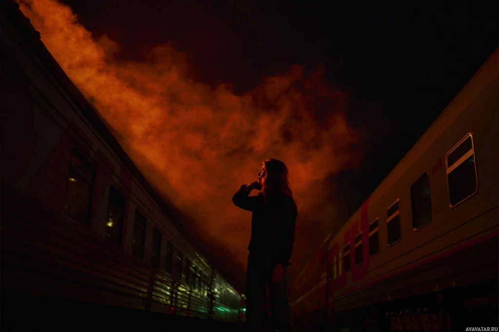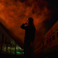 a night scene with a person standing on the tracks in front of a moving train. There is visible smoke or fire in the air, and the sky has a reddish hue, which could be due to