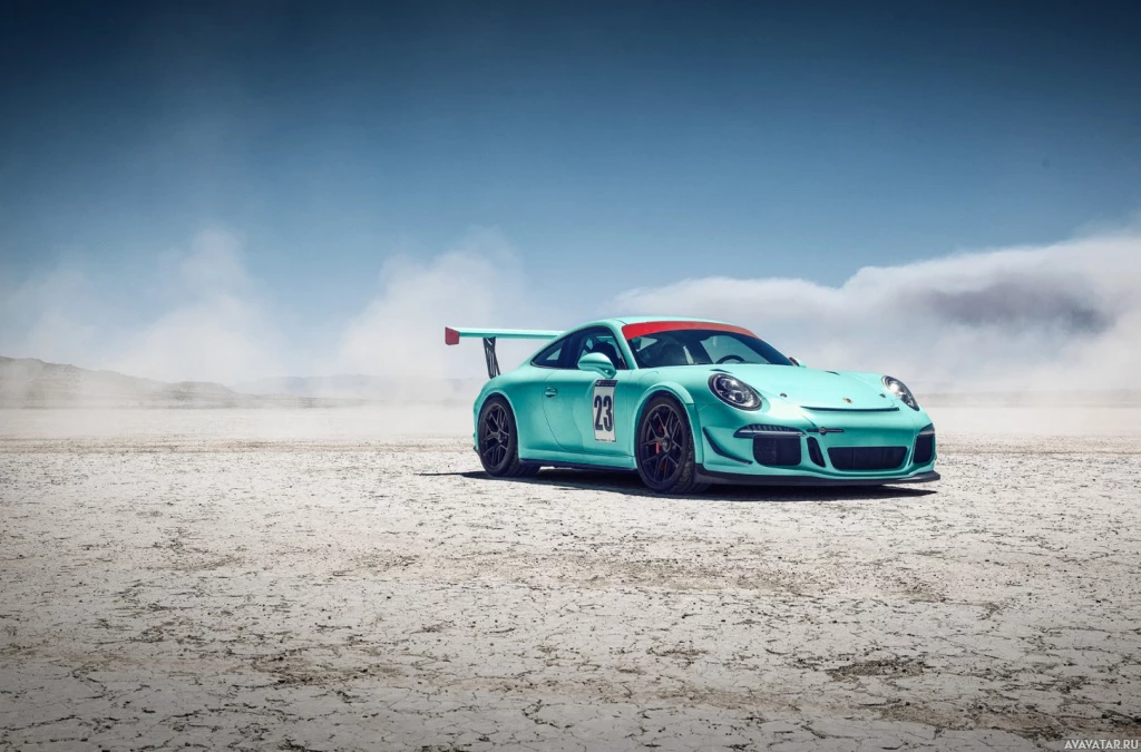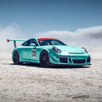 sports car, likely a GT2 model, set against the backdrop of a desert-like environment with clear skies and minimal dust or sand. The car is positioned at an angle that showcases its design elements such as the aerodynamic bodywork, large