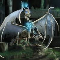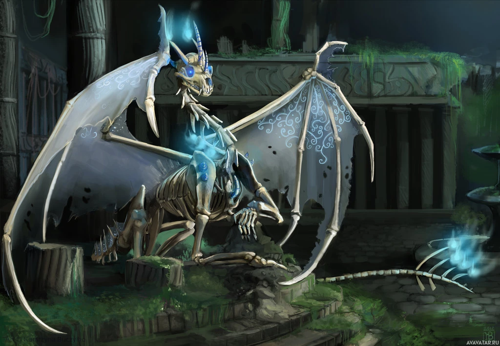 a fantasy creature that appears to be a combination of a dragon and a skeleton. It's perched on what looks like a set of stairs or ruins, giving off