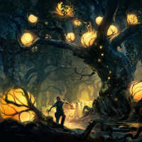 the enchanted atmosphere. The lighting suggests it is either twilight or night, adding to the overall eerie and mysterious mood of the image.