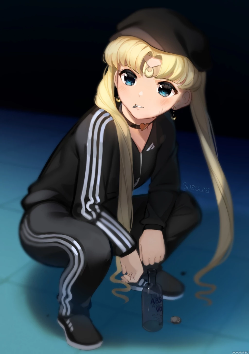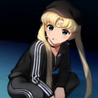an anime character with a resemblance to Sailor Moon, wearing a black beret and a tracksuit with the Adidas logo. She has long