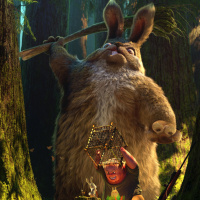 an animated scene featuring a large, anthropomorphic hare and a smaller rabbit. The hare appears to be in the process of building a structure or digging with a stick, while the rabbit is looking at it with curiosity or concern. There's also a bird flying by in the background. The setting seems to be