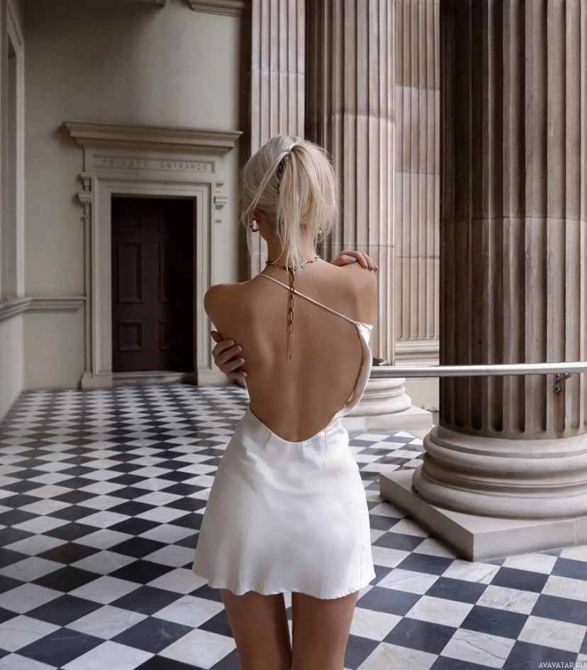 white hair and is wearing a sleeveless, knee-length dress in what appears to be an outdoor setting with architectural features such as columns. The person's pose suggests they might be posing for a photograph or simply enjoying the moment.