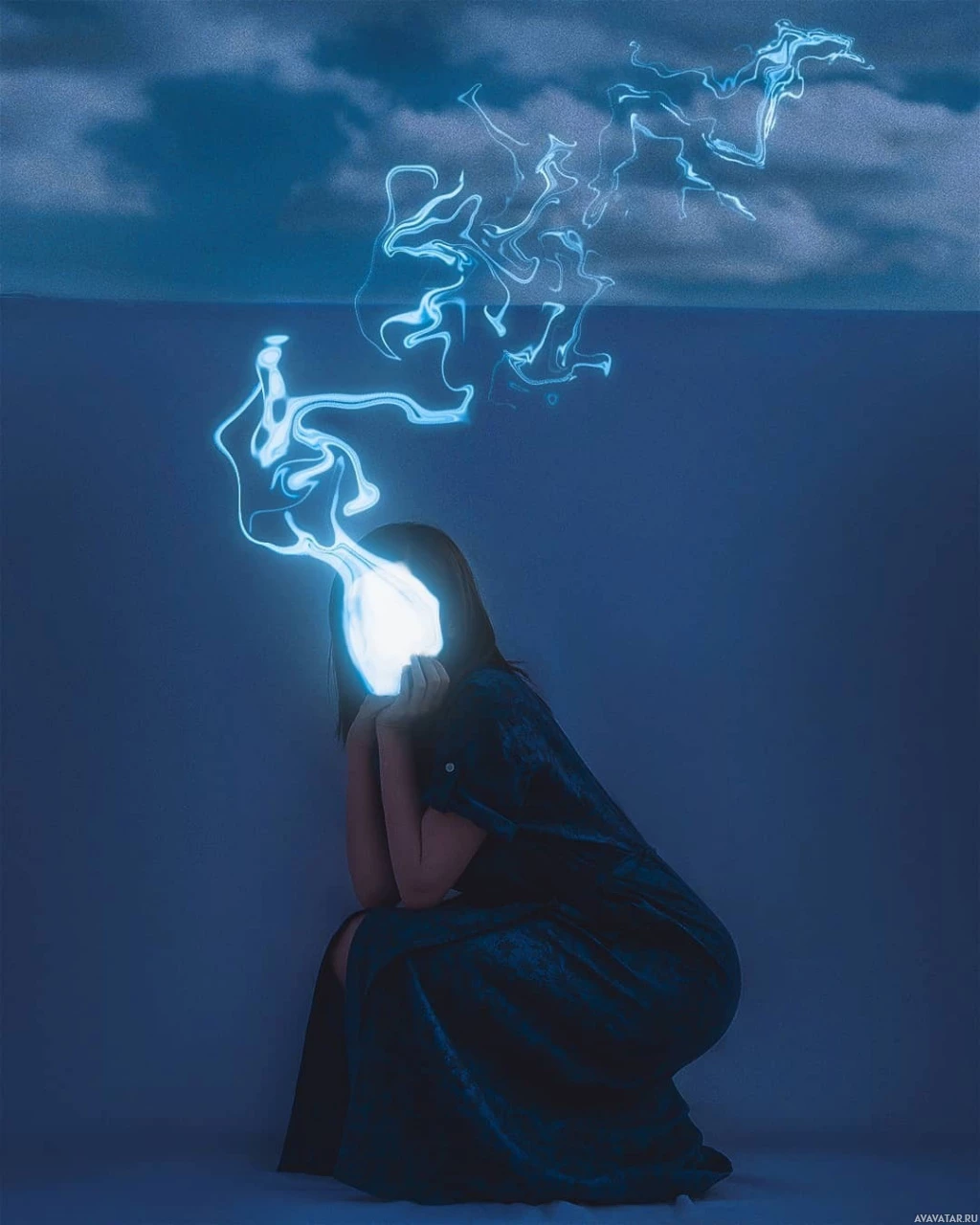 The image shows a person sitting with their back to the viewer, looking at what appears to be an illusion of smoke coming from their head. The smoke is in motion and has been artistically rendered to give the impression that it's emanating from the individual's mind or thoughts. The lighting in the image is dim, suggesting either