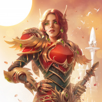 На картинке изображен персонаж женского пола с рыжими волосами, одетый в доспехи, которые, по-видимому, выполнены в стиле фэнтези, что позволяет предположить, что она может быть эльфом или частью фантастического окружения. Персонаж держит посох и уверенно стоит на фоне, напоминающем магическую сцену с вихревыми энергетическими узорами.