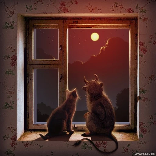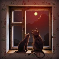 an open window. The setting is nighttime, with the moon visible in the sky, suggesting that it might be