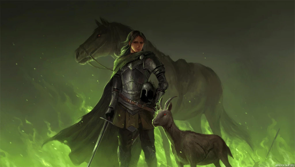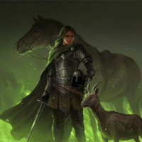 The image depicts a fantasy-themed character. This individual is dressed in armor and riding a horse, suggesting they are a warrior or knight. They are holding a sword and appear to be wearing a cloak, which adds to their medieval appearance. In the background, there's