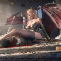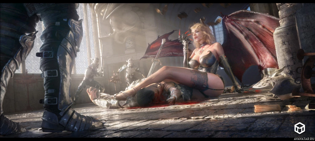 a female character who resembles a succubus, an entity from mythology known as an incubus or succubus, typically depicted as seductive and tempting. The succubus is shown in