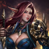 intricate designs that give her a formidable appearance. In her hand, she holds a sword that complements her warrior-like attire. The background suggests a dramatic or battle-like scenario, fitting the theme of fantasy and adventure.