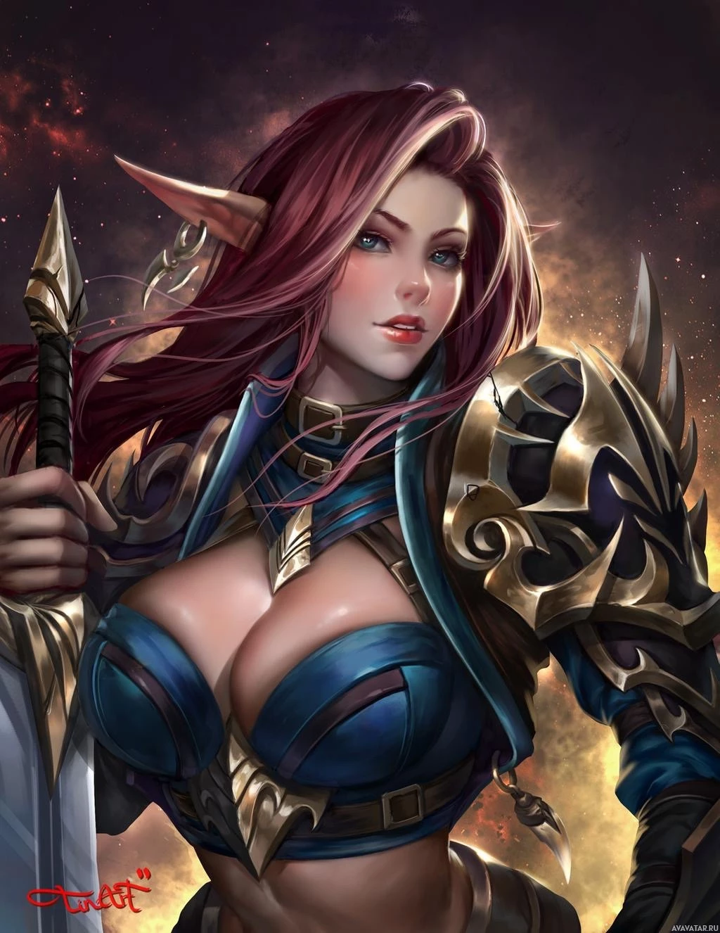 red hair and pointed ears, which are characteristic features of elves in fantasy media. The character is wearing armor with