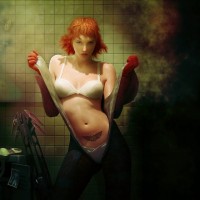 black lingerie, with one of her breasts visible. Her pose suggests confidence and a sense of boldness. The overall tone of the image is quite dramatic and intense, contributing to an atmosphere that might be described as edgy or provocative.