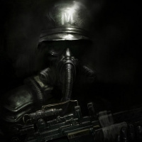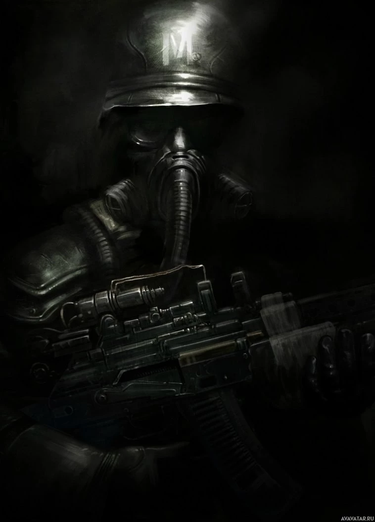 a gas mask, which has a filter over the mouth area for protection against airborne hazards like chemical agents. The person is holding a gun in their hands, suggesting they might be prepared for combat or some