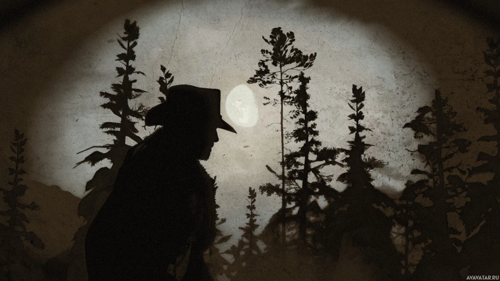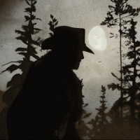 a silhouette of a man standing in what looks like a forest at dusk, with the setting sun low on the horizon and casting long shadows. The man is wearing what could be interpreted as traditional western attire, including