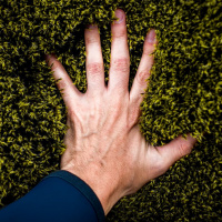 На картинке изображена рука, касающаяся поверхности из искусственной травы. Похоже, что это рука человека, но личность человека на этом снимке не видна.