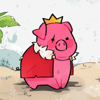 The picture features a cartoon pig wearing a crown and sitting on the ground. It appears to be dressed as royalty, possibly with a regal or fairy-tale theme. There's a natural environment around it, including what looks like tree leaves in the background, suggesting a forest setting.