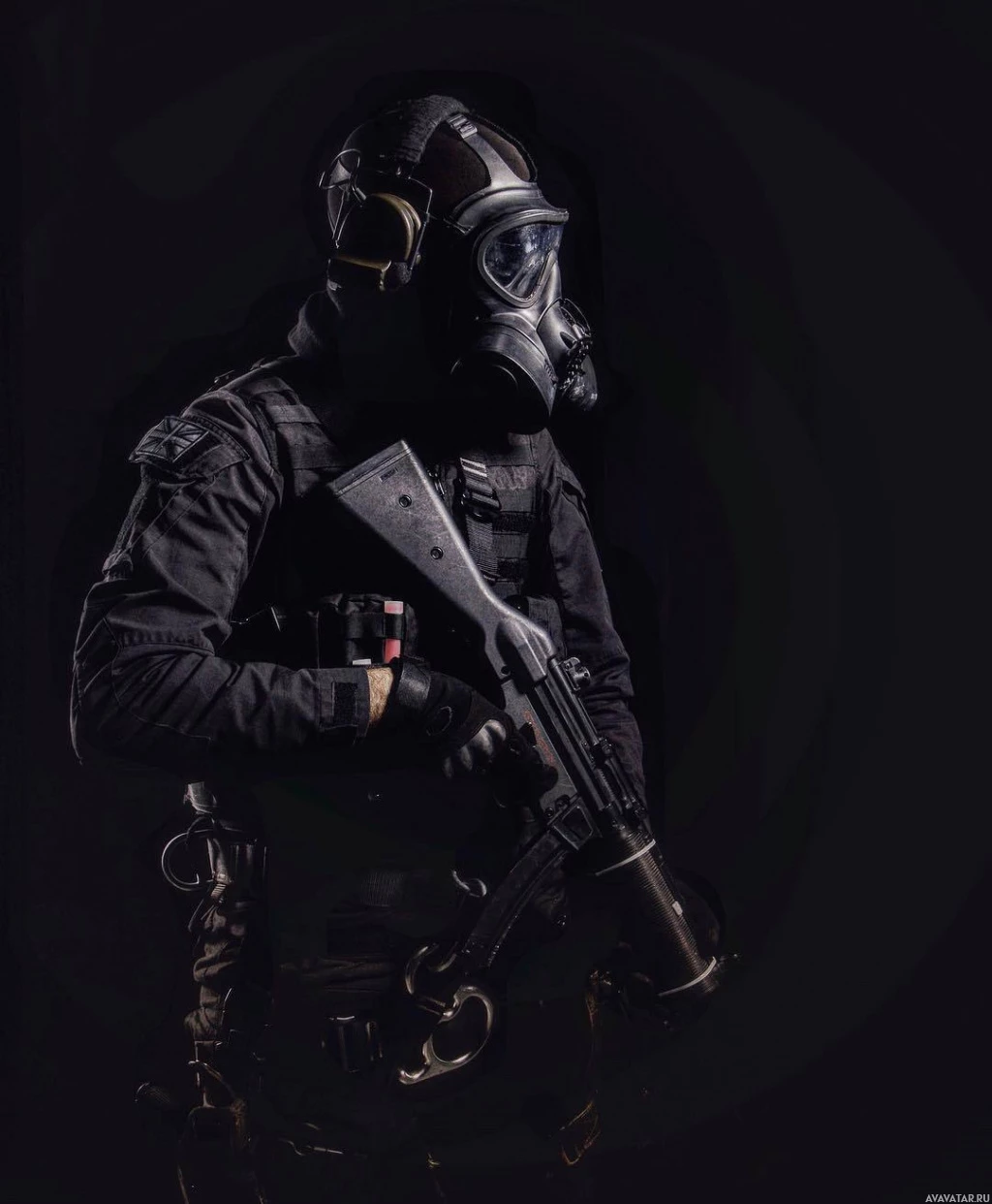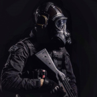 a gas mask, likely for hazardous environments or situations requiring respiratory protection. They are also equipped with a firearm, which suggests they may be involved in