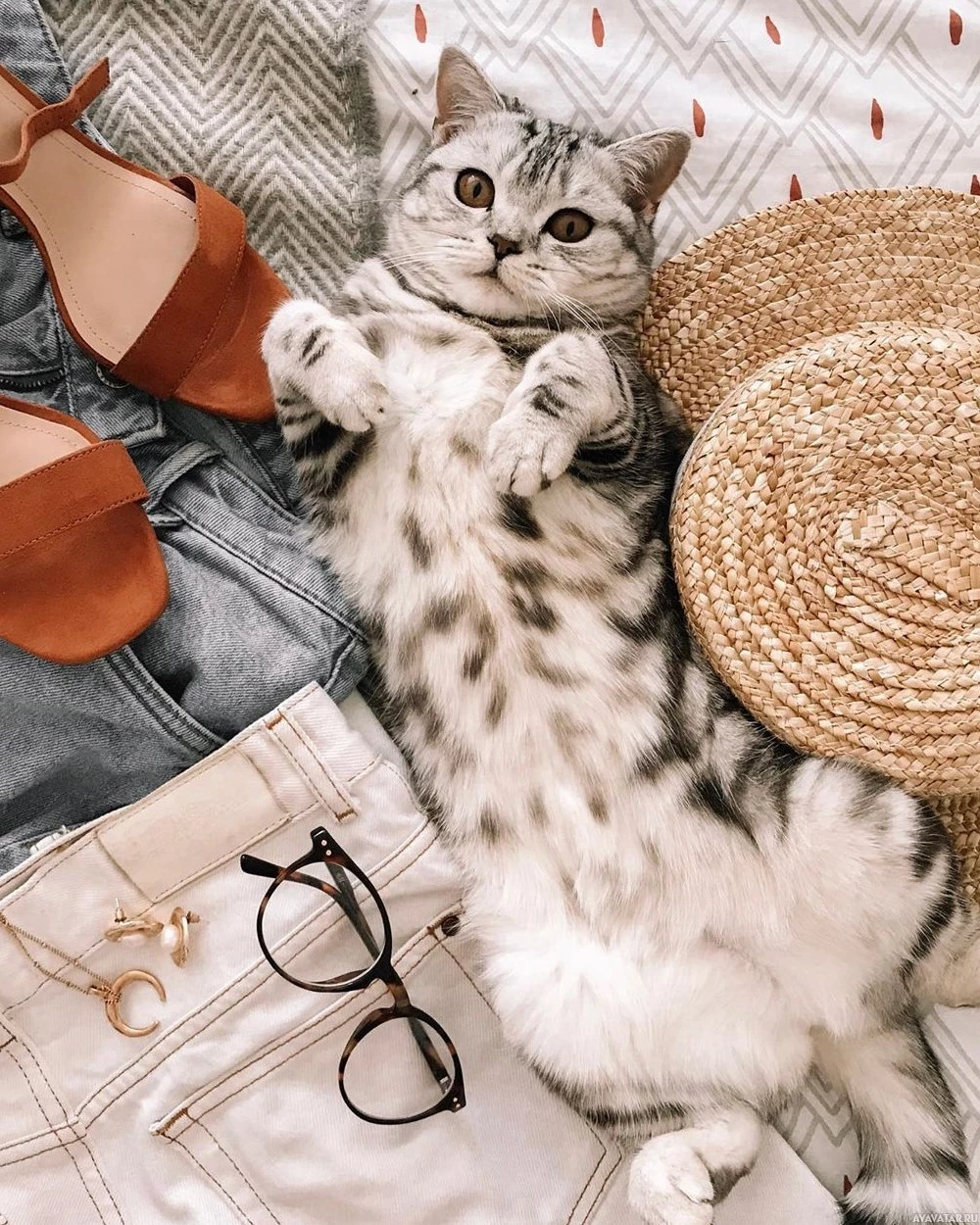 The image shows a cat lying on its back among various items, including clothing and accessories such as sunglasses. The cat appears to be a grey tabby with