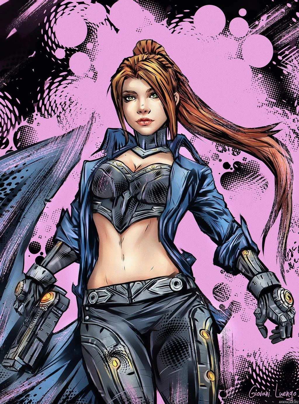 red hair tied into a high ponytail and is wearing what appears to be a futuristic or sci-fi outfit, including a jacket with what looks like armor elements, gloves, and boots that could suggest she is a warrior or soldier in a fantasy or science fiction setting. The artwork has